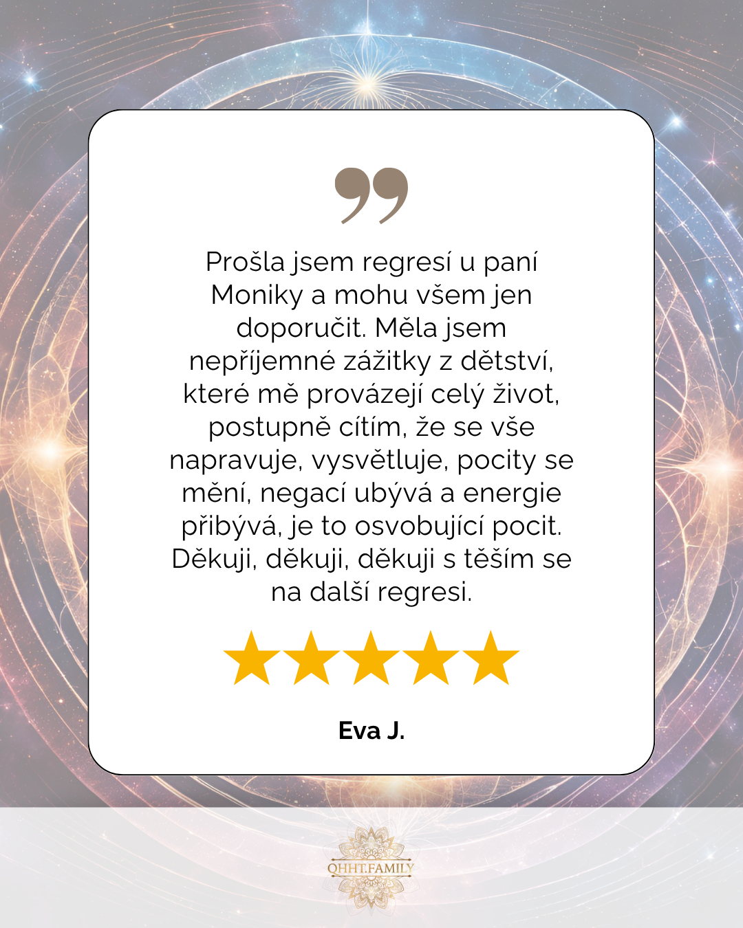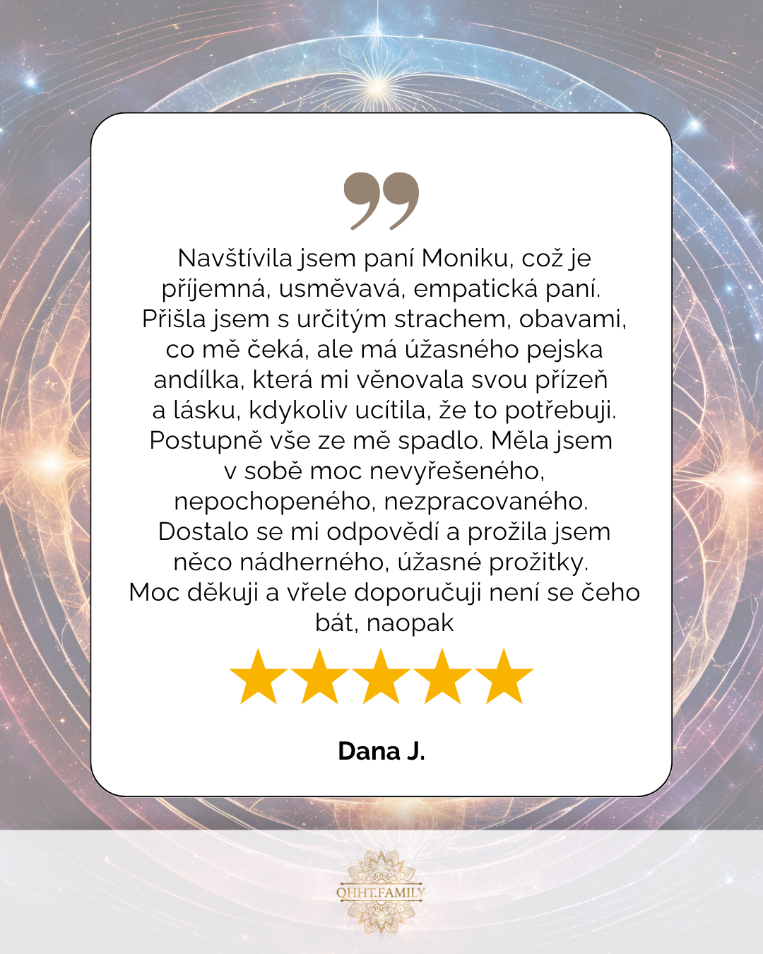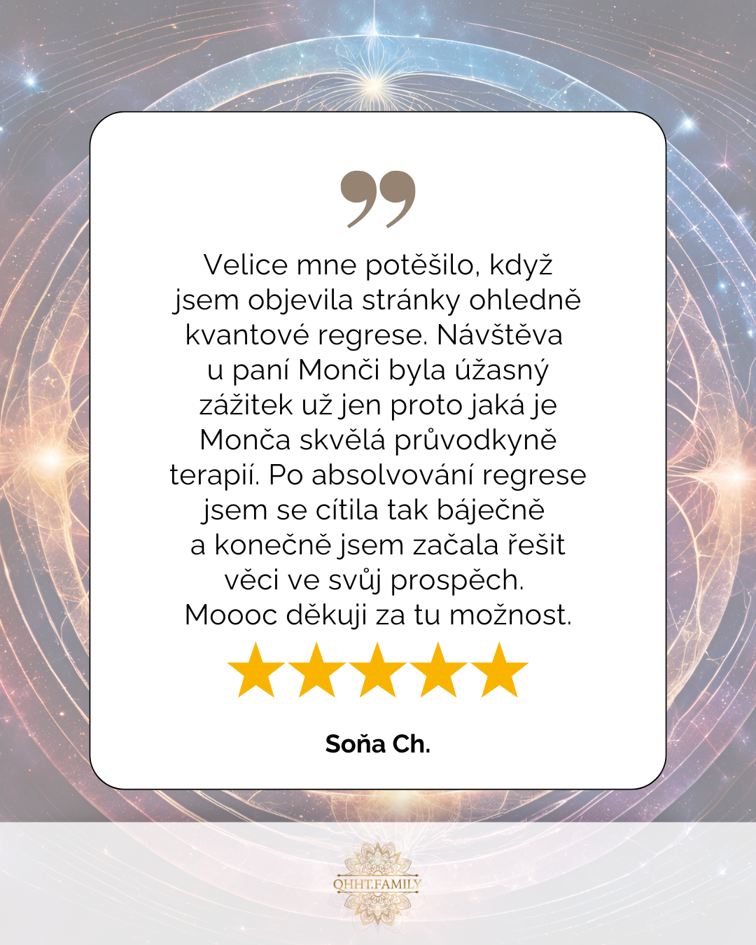 Po absolvování QHHT se Monika přesvědčila, že tato technika představuje jednu z nejvyšších forem práce s lidským vědomím a nabízí silný, láskyplný a zároveň velmi bezpečný způsob, jak nacházet odpovědi i hluboké uzdravení. QHHT jí přináší nejen intenzivní osobní prožitky, ale i pokoru, vděčnost a hlubokou úctu k lidské duši.
