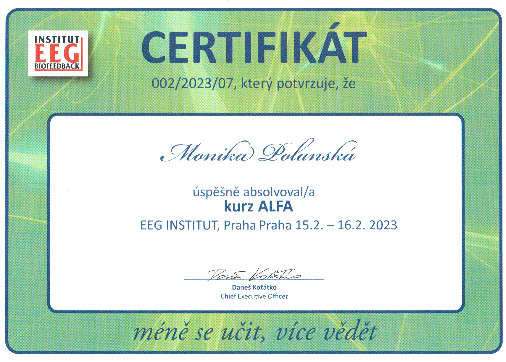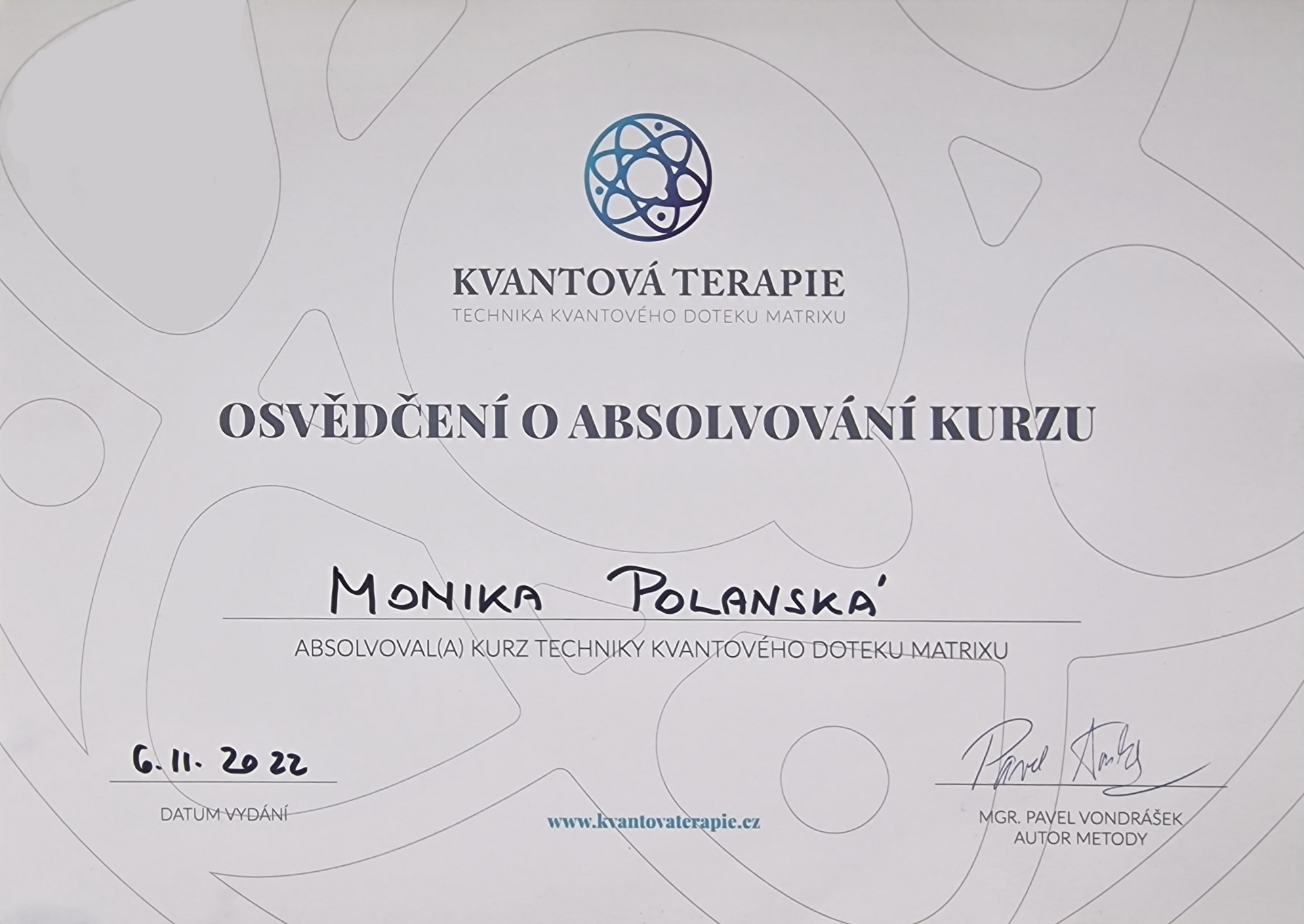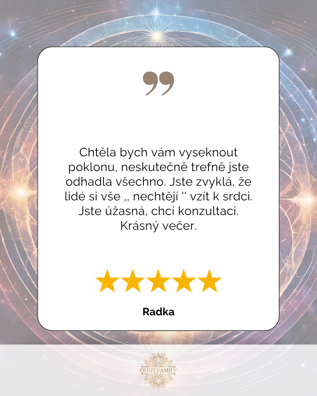 Po absolvování QHHT se Monika přesvědčila, že tato technika představuje jednu z nejvyšších forem práce s lidským vědomím a nabízí silný, láskyplný a zároveň velmi bezpečný způsob, jak nacházet odpovědi i hluboké uzdravení. QHHT jí přináší nejen intenzivní osobní prožitky, ale i pokoru, vděčnost a hlubokou úctu k lidské duši.